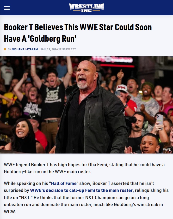 Stacie Lee+FollowCould Oba Femi Be WWE’s Next Goldberg?Booker T just dropped a bold take on his 'Hall of Fame' show, saying Oba Femi could go on a Goldberg-style undefeated streak now that he’s headed to the main roster. The NXT powerhouse has already relinquished his title, and Booker thinks WWE’s got big plans to keep him “white hot.” Could we be witnessing the start of a new legendary run? What do you think—will Femi dominate like Goldberg, or is the hype too much? #Sports #Wrestling #WWE20Share