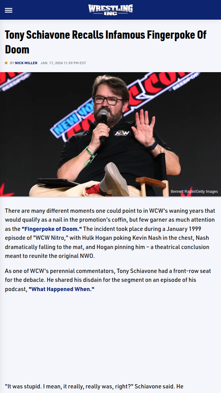 dbrown+FollowRemembering WCW’s Fingerpoke of DoomHardcore wrestling fans, let’s talk about the infamous Fingerpoke of Doom on Nitro in ‘99. Hollywood Hogan just poked Big Sexy Nash, Nash took a dive, and the NWO was back together—but at what cost? Tony Schiavone, who called the action that night, recently called it “stupid” on his podcast. Many say this moment marked the beginning of the end for WCW. Was this the worst booking decision ever, or just misunderstood? #Sports #Wrestling #WCW10Share