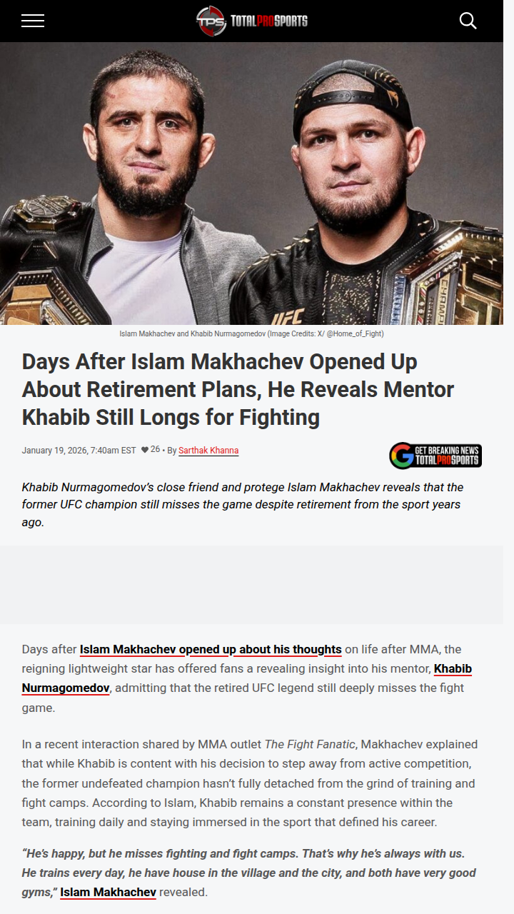 Kayla Mcconnell+FollowDoes Khabib Still Have the Fire to Fight?Just days after Islam Makhachev talked about his own retirement plans, he gave fans a rare look into his mentor Khabib’s mindset. Even though The Eagle is officially retired, Islam says Khabib still misses the fight game and stays active in the gym with the team. It’s wild to think that even legends like Khabib never fully leave the Octagon behind. Do you think we’ll ever see him back, or is he content as a coach? #Sports #Wrestling #Khabib00Share