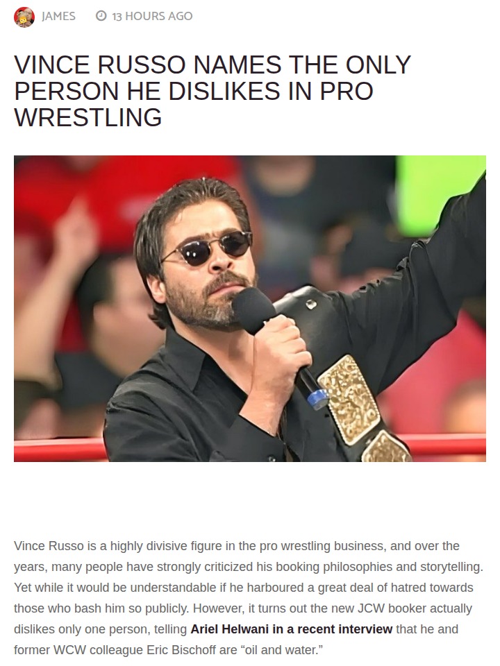Melissa Wyatt+FollowRusso vs Bischoff: Wrestling's Real HeatVince Russo just dropped a bombshell on the pro wrestling world, revealing in a candid interview that Eric Bischoff is the only person he truly dislikes in the business. The tension between these two creative minds dates back to their WCW days, where their clashing philosophies became legendary. Russo says, "Bro, you’re 70 and still cutting promos on me!" Classic Russo. What do you think—was this rivalry the real reason behind WCW’s downfall? #Sports #Wrestling #WrestlingDrama20Share