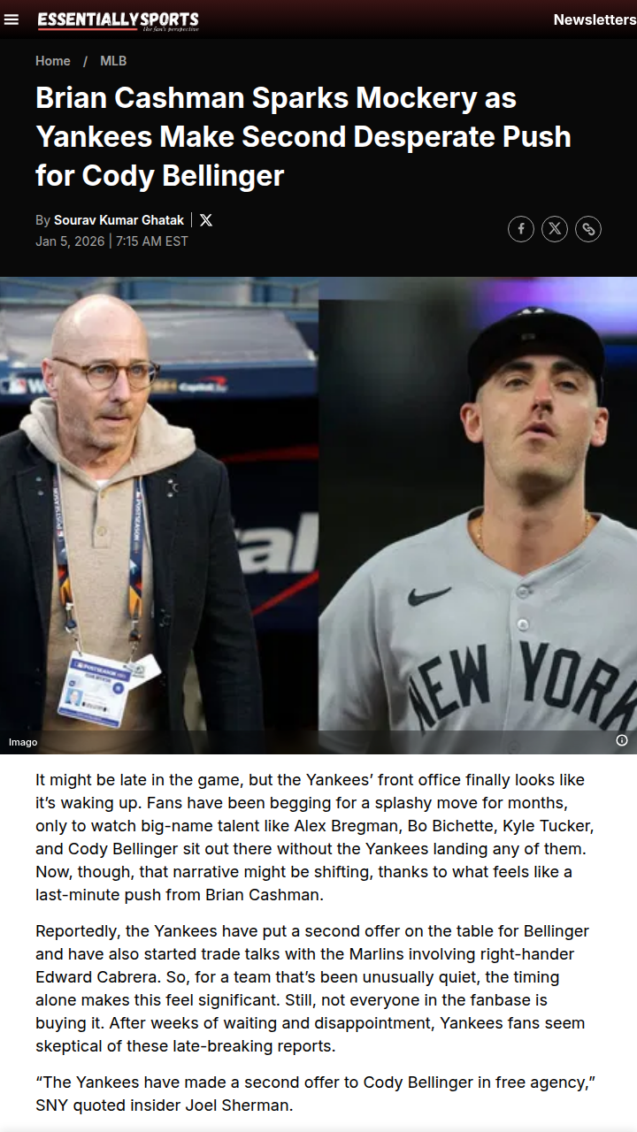 Catherine Reeves+FollowYanks, Boras & Belli: The Waiting GameLooks like the Bronx Bombers are back at it, making a second offer to Cody Bellinger. But before we get too hyped, remember—Scott Boras is running the show. This is classic Boras: counter, stall, and let the market set itself. The Yankees have backup plans with The Martian (Dominguez) and Spencer Jones, but Belli would bring real stability. Don’t expect fireworks yet—this cat-and-mouse could drag on all winter. #Sports #Baseball #Yankees00Share