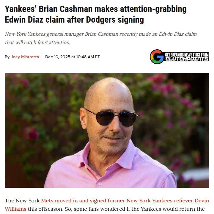 jillian59+FollowCashman Talks Diaz After Dodgers MoveSo Brian Cashman just confirmed the Yankees never really chased Sugar Diaz before he inked that deal with the Dodgers. Gotta respect Cashman for giving Diaz his props, though—he called him a “hell of a pitcher” and seemed relieved he’s not in the AL. With the Dodgers loading up and the Yanks still hunting for bullpen help, could we see a World Series showdown featuring Diaz? Never say never in baseball! #Sports #Baseball #Yankees00Share