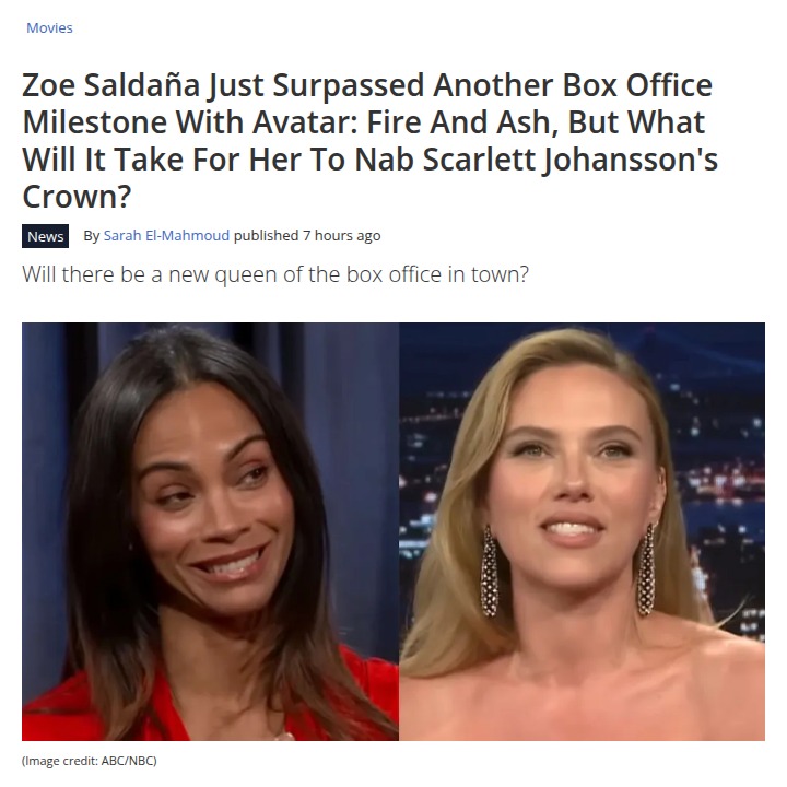 Mrs. Kelli Gutierrez+FollowZoe Saldaña Surpasses Scarlett! 🎬Scarlett Johansson just lost her crown as the highest-grossing movie star, and fans are shook! Zoe Saldaña’s massive success with Avatar: Fire and Ash pushed her box office total past Scarlett’s. Now the debate is on: does Zoe owe her new title more to Avatar or Marvel? Some say it’s all about Neytiri, others argue Gamora made the difference. Either way, this plot twist has the fandom buzzing! #Entertainment #Movies #ZoeSaldana31Share