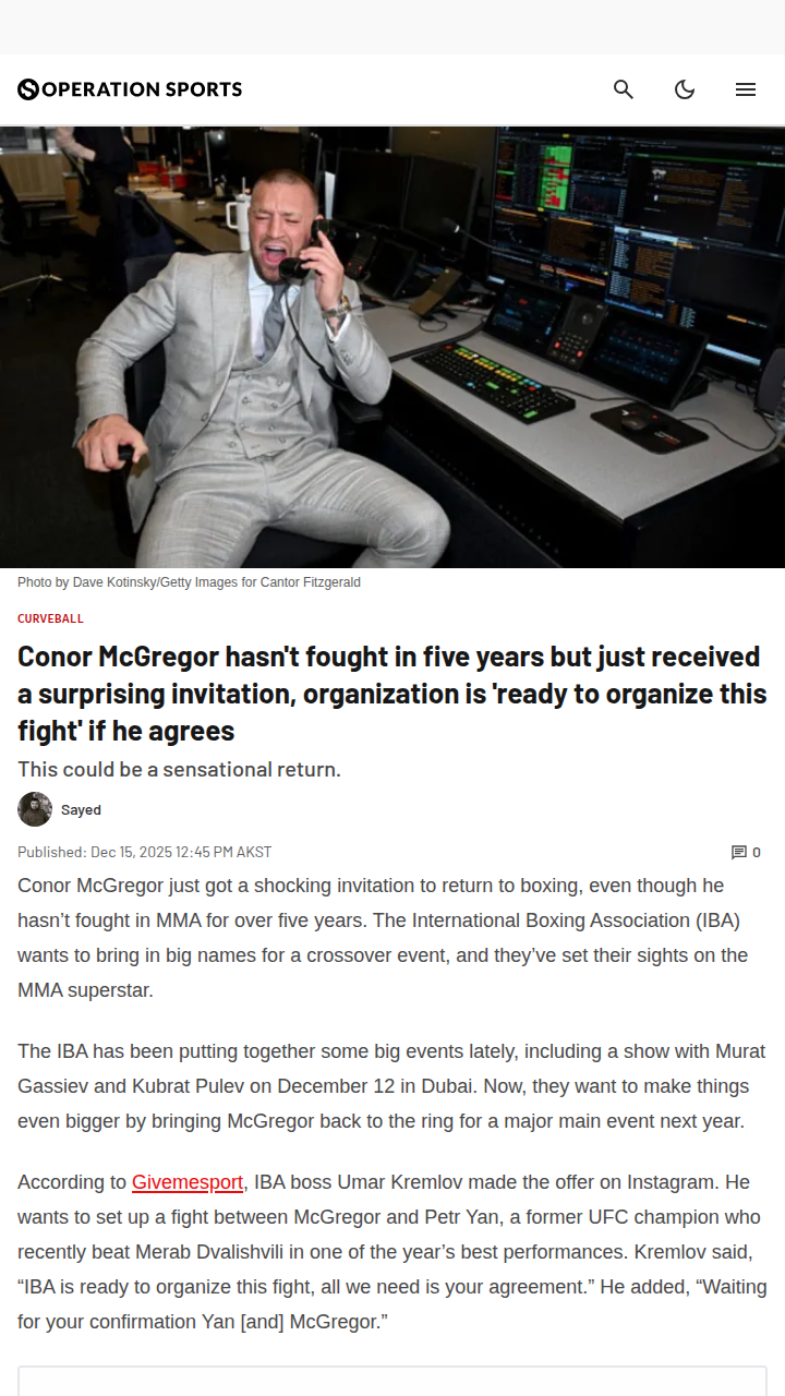 reneewang+FollowMystic Mac Eyes Boxing Comeback?So, the IBA just threw down a wild challenge to Mystic Mac, inviting him back to the boxing ring after five years away. They want to set up a mega-crossover fight with Petr Yan, but there’s a catch—McGregor’s still got UFC business and is laser-focused on chasing that welterweight belt for the triple crown. Would you rather see him glove up or go for UFC gold? This could be the rivalry of 2026 if it ever happens! #Sports #Wrestling #ConorMcGregor00Share