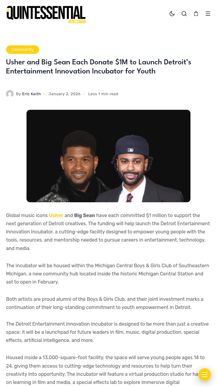 Leah Gonzales+FollowDetroit’s youth get $2M boost for creative futuresUsher and Big Sean are putting $2 million on the table to help Detroit’s next wave of young creators break into entertainment and tech. Their new Detroit Entertainment Innovation Incubator, opening soon in the historic Michigan Central Station, will be packed with high-tech studios, special effects labs, and a creators’ lounge—all for local youth ages 14 to 24. It’s more than just a cool hangout: this space will connect young people with real-world mentors, industry credentials, and the tools to turn their ideas into careers. What do you think—will this change the game for Detroit’s creative scene? #Entertainment #Celebrity #Detroit00Share