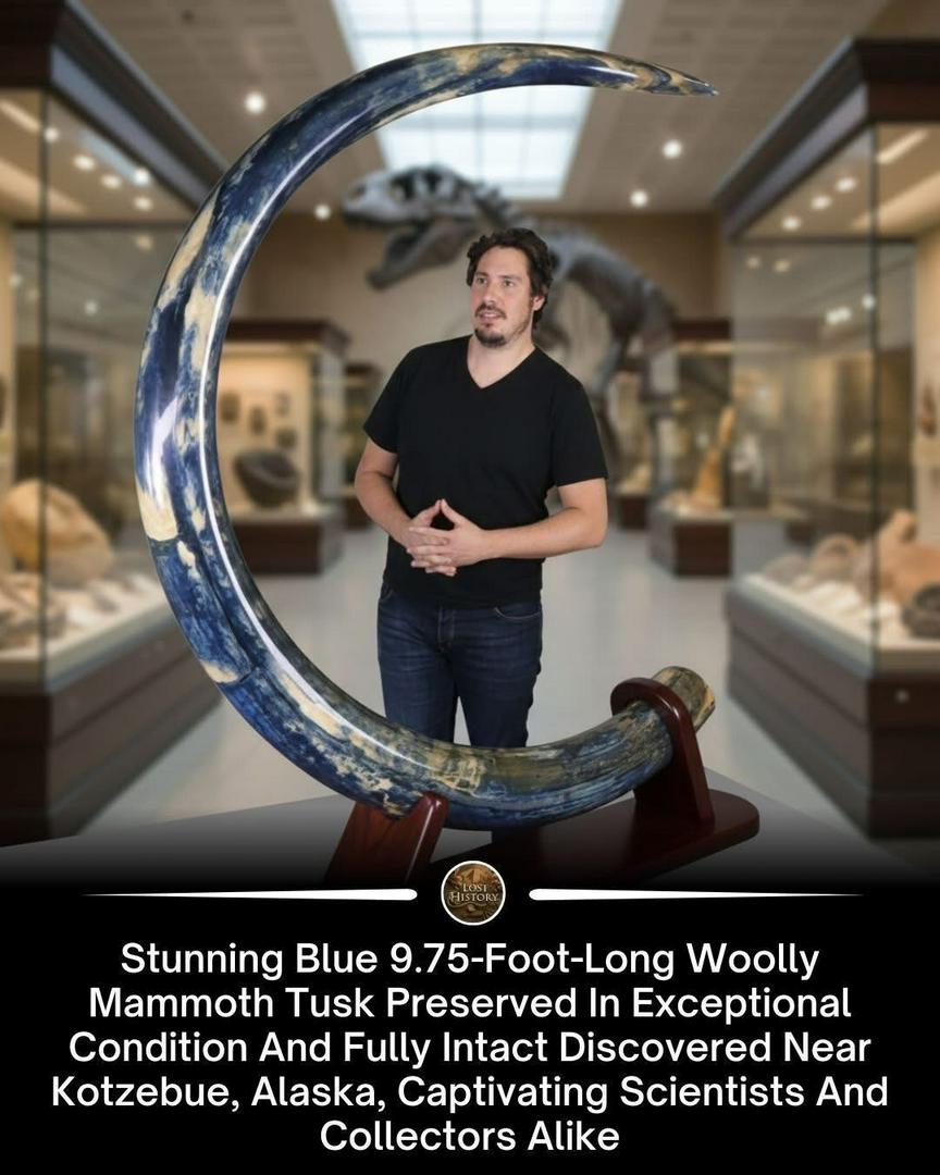 Remarkably blue woolly mammoth tusk, measuring 9.75 feet long, has been discovered near Kotzebue, Alaska, preserved in extraordinary condition and fully intact. Its immense size, pronounced curvature, and dense ivory make it one of the most extraordinary specimens ever recovered. The striking blue coloration comes from rare vivianite mineral present throughout the tusk, interwoven with soft creamy tones. Vivianite forms when apatite in bone and ivory reacts with iron, creating vivid green-blue hues. The result is a color reminiscent of Earth viewed from space, making the tusk visually stunning as well as scientifically significant. Experts note that the fossil’s preservation is exceptional. Dense, solid ivory and complete integrity allow for detailed study, while Schreger line angles distinguish it from modern elephant ivory. This level of preservation is rare, and such tusks are often refined, polished, and collected due to their aesthetic and scientific value. Weighing 119 pounds with a circumference of 18.5 inches, this tusk stands out not only for size but also for its rarity and visual impact. Mammoth ivory of this quality can be traded legally without CITES restrictions, making it a unique specimen in both paleontology and private collection circles. This blue woolly mammoth tusk reminds us that the Ice Age continues to reveal remarkable treasures. It connects modern observers with creatures that roamed Alaska thousands of years ago, preserving both scientific insight and awe-inspiring beauty. #losthistory #fblifestyle #history #iceage #archaeology #mammoth #facebookrepost