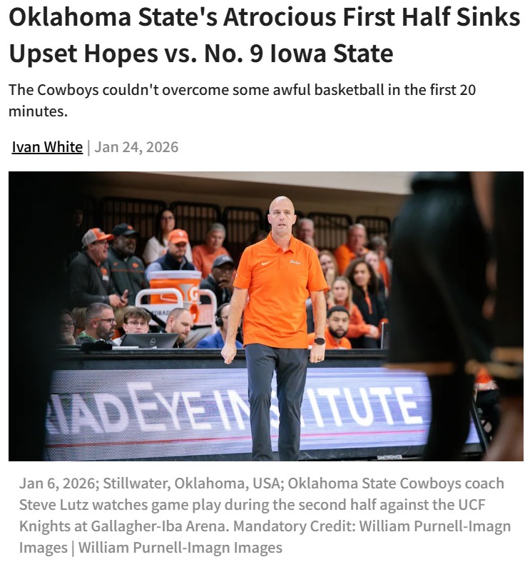 Jay Williams+FollowCowboys’ rough first half costs them bigOklahoma State fans saw a wild swing in Gallagher-Iba Arena—after a disastrous first half, the Cowboys nearly pulled off a miracle comeback against No. 9 Iowa State. The energy in Stillwater was electric despite the snow, but OSU’s early defensive lapses and cold shooting dug a hole too deep to escape. The Cowboys rallied hard after halftime, showing real grit, but it was too late. It’s clear: if OSU wants to compete with top teams, they can’t afford to sleepwalk through the opening 20 minutes. What do you think needs to change for the Cowboys to turn things around? #Sports #Football #OKState00Share