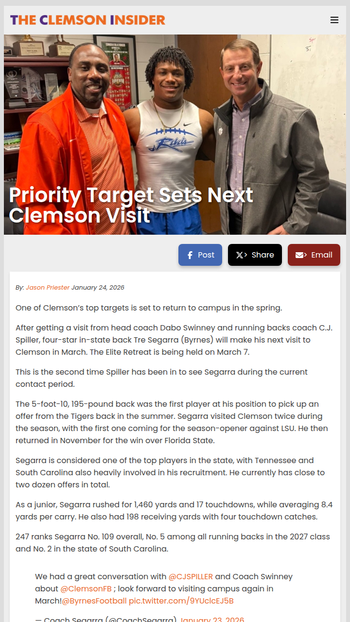Christopher Hughes+FollowClemson’s top RB target returns in MarchClemson fans, all eyes are on Tre Segarra as he gears up for another visit to campus this March. After a standout junior season with over 1,400 rushing yards and 17 touchdowns, Segarra’s recruitment is heating up, with Tennessee and South Carolina also in the mix. He’s already made a couple of trips to Death Valley, and the Tigers were the first to offer him last summer. With nearly two dozen offers on the table, how big of an impact do you think Segarra could have if he chooses Clemson? Let’s talk about what his commitment could mean for the Tigers’ future. #Sports #Football #ClemsonFootball00Share