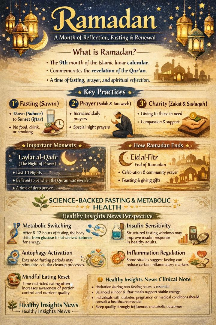 Breaking News - Health Talk - Ramadan Wellness 🌙✨ Fast Well: Science‑Backed Ramadan Tips to Protect Your Health This Month Ramadan offers spiritual and potential metabolic benefits but to reap them safely, prioritize hydration, balanced suhoor/iftar meals, sleep, and medical guidance. Ramadan merges deep cultural meaning with measurable metabolic effects such as metabolic switching, potential autophagy, and improved insulin sensitivity for some people. Health experts say the benefits are most likely when fasting is paired with careful attention to hydration, nutrient balance, and sleep. Practical guidance for a healthier fast: - Hydrate well during non‑fasting hours and alternate water with electrolyte sips after iftar. - At suhoor, choose a mix of protein + fiber (eggs, yogurt, oats, beans) to sustain energy and curb mid‑day cravings. - Avoid sugary iftar spikes; pair sweets with protein or nuts to blunt blood‑sugar surges. - Prioritize consistent sleep timing where possible tracking sleep for a week can help identify improvements. - People with diabetes, pregnancy, breastfeeding, or chronic conditions should consult their healthcare provider before fasting. This week: add one gut‑friendly food to iftar (yogurt, fermented veg, or fiber‑rich dates), track sleep for 7 days, and save this post to plan your Ramadan meals. “Ramadan can support metabolic health when practiced mindfully hydration, balanced meals, sleep, and medical guidance are the keys,” says your favorite health revolutionary, storytelHER. #Ramadan #Fasting #HealthTips #MetabolicHealth #Wellness #HealthNews #BreakingNews #healthyinisghtsnews #holy #RamadanFasting #RamadanMeal