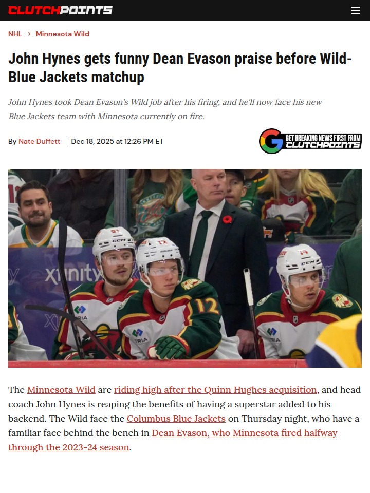 stacy28+FollowEvason’s Wild Jab at Hynes Before ShowdownThe Minnesota Wild are buzzing after landing Quinn Hughes, and Coach John Hynes is making the most of it. But before facing the Blue Jackets, ex-Wild coach Dean Evason couldn’t resist a playful jab, telling media, “They’re coached better.” It’s all in good fun, but you can tell Evason wishes he had this version of the Wild. With the Central Division heating up, do you think Hynes can lead the Wild on a deep playoff run? #Sports #IceHockey #MNWild00Share