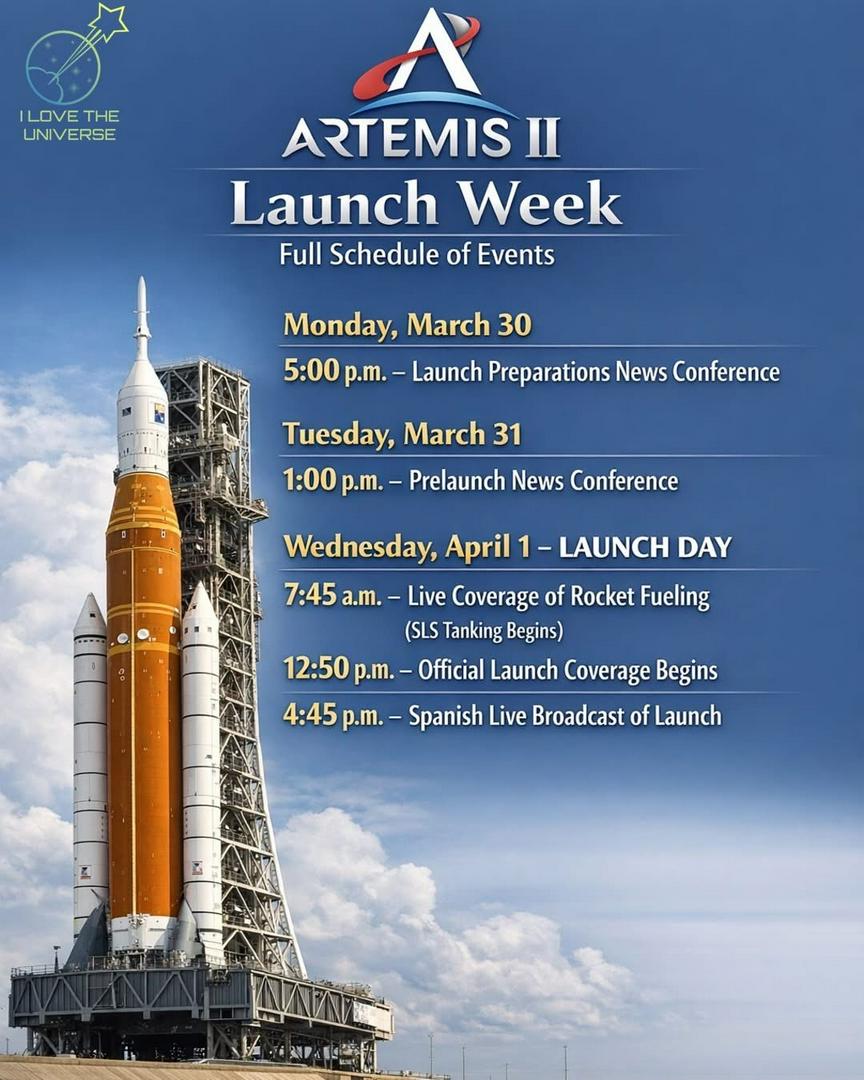 justme +Follow🚀 HUMANITY RETURNS TO THE MOON — ARTEMIS II LAUNCH WEEK More than 50 years after Apollo 17 mission, we’re standing on the edge of history again. This is the countdown to Artemis II — the first mission that will send astronauts around the Moon and back in a new era of exploration. 📅 Monday, March 30 🕔 5:00 p.m. – Final launch preparations briefing 📅 Tuesday, March 31 🕐 1:00 p.m. – Prelaunch press conference 📅 Wednesday, April 1 — LAUNCH DAY 🕢 7:45 a.m. – Live coverage begins as the Space Launch System is fueled 🕛 12:50 p.m. – Official launch broadcast starts 🕟 4:45 p.m. – Spanish live coverage of liftoff Carrying humans aboard the Orion spacecraft, this mission will push us beyond Earth orbit once again — farther than any crew has traveled in decades. No landing this time. Just a bold step… back into deep space. 🌕 The Moon is no longer the finish line — it’s the beginning. Watch it. Feel it. Share it. Because this isn’t just another launch… This is humanity rising again. #Artemis #NASA #MoonMission #Space #Launch #DeepSpace #Orion #SLS00Share