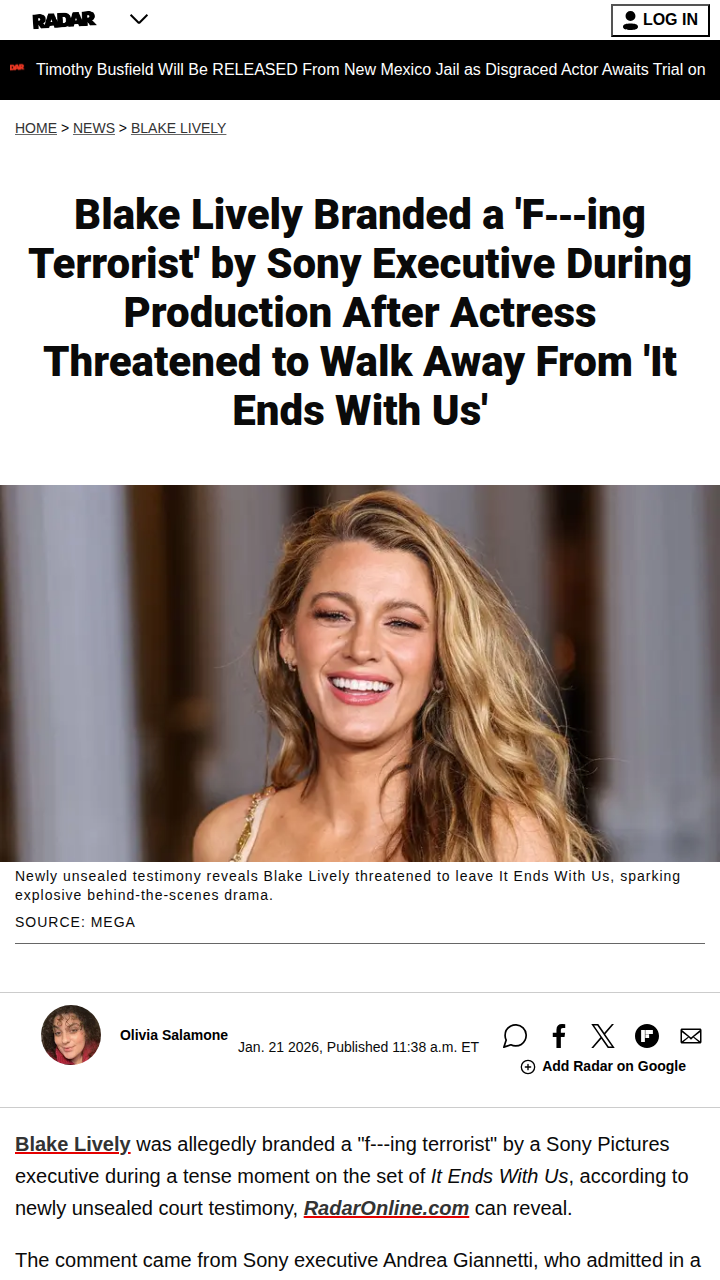 Jason Curtis+FollowBlake Lively vs Sony Execs: Set Meltdown! 🔥Blake Lively was called a 'f---ing terrorist' by Sony exec Andrea Giannetti after threatening to walk from 'It Ends With Us' unless her 17 demands were met. Court docs reveal Giannetti admitted the outburst, blaming production stress and $28M on the line. Fans are split: was Blake standing up for herself or being a diva? The drama only deepened as Lively’s harassment claims and retaliation accusations came to light in newly unsealed testimony. #Entertainment #Movies #BlakeLively10Share
