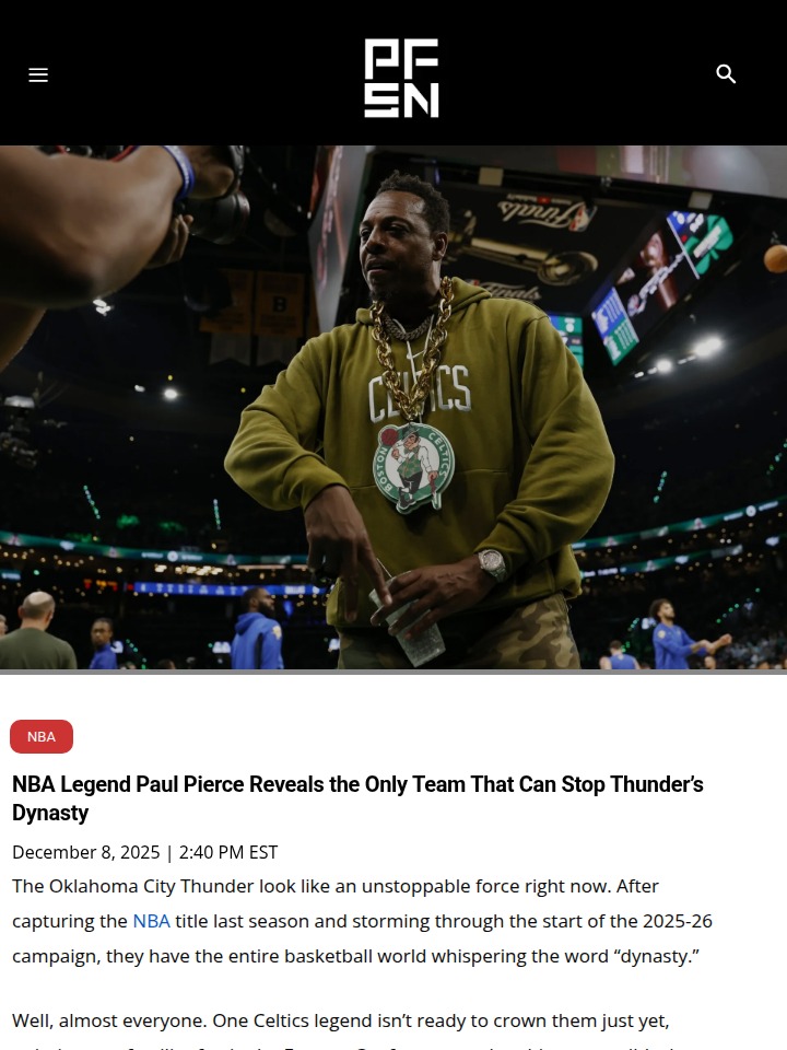 Theresa Boyd+FollowCan Boston End Thunder’s Dynasty Dreams?Paul Pierce, aka “The Truth,” just dropped a hot take: he thinks his Celtics are the only squad that can stop the Thunder from running the league for the next five years. While OKC’s young core and Chet Holmgren’s length have fans talking dynasty, Pierce says Boston’s depth and star power are the real threat. Not everyone’s buying it, though—Danny Green points out OKC’s size mismatch. Who do you believe: the legend or the numbers? #Sports #Basketball #NBA00Share