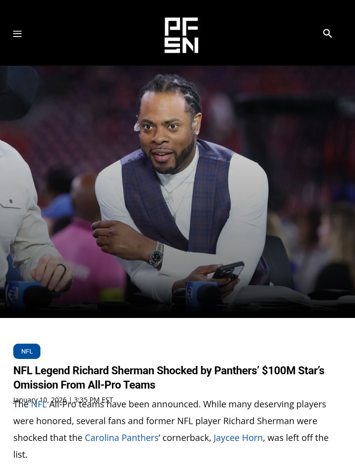 phughes+FollowPanthers’ Jaycee Horn Snubbed—Sherman Sounds OffCan’t believe Jaycee Horn got left off the All-Pro teams! Richard Sherman (the original Legion of Boom) is just as shocked as Panthers fans. Horn put up 5 picks and 37 tackles, plus he’s the league’s highest-paid DB after that $100M deal. Sherman’s right—what more does Horn have to do to get some respect? Let’s see if he makes a statement in the Wild Card against the Rams. Anyone else think the All-Pro voters missed the mark? #Sports #Football #Panthers00Share