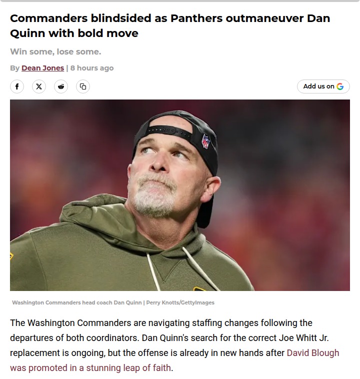 Jeffrey Armstrong+FollowPanthers Block Commanders’ QB Coach PlansWild move in the NFC South rivalry! The Commanders thought they had a shot at landing Mike Bercovici as their new QBs coach, but the Panthers pulled a fast one—promoting him to pass-game coordinator before Dan Quinn could even make his pitch. Looks like Carolina is serious about keeping their offensive brain trust together after last season’s division title. Meanwhile, Washington’s rolling with D.J. Williams, who’s got big shoes to fill and a legacy to uphold. Thoughts on how this shakes up both teams’ coaching staffs? #Sports #Football #Panthers00Share