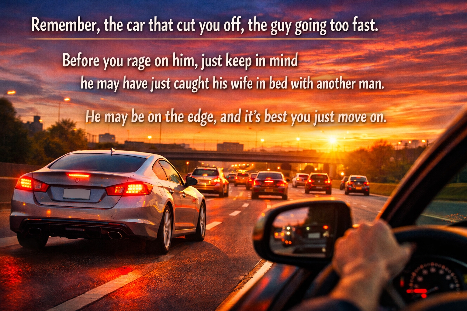 J.Smith+FollowNot Worth It Remember, the car that cut you off, the guy going too fast. Before you rage on him, just keep in mind he may have just caught his wife in bed with another man. He may be on the edge, and it’s best you just move on.#roadrage #RoadRageAwareness #RoadSafety00Share