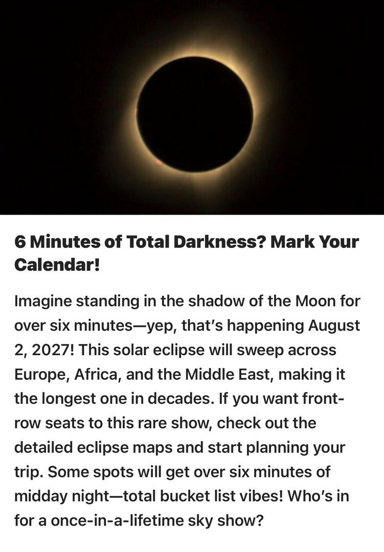 justme +FollowImagine standing in the shadow of the Moon for over six minutes—yep, that’s happening August 2, 2027! This solar eclipse will sweep across Europe, Africa, and the Middle East, making it the longest one in decades. If you want front-row seats to this rare show, check out the detailed eclipse maps and start planning your trip. Some spots will get over six minutes of midday night—total bucket list vibes! Who’s in for a once-in-a-lifetime sky show? #Science #SolarEclipse2027 #EclipseChasers20Share