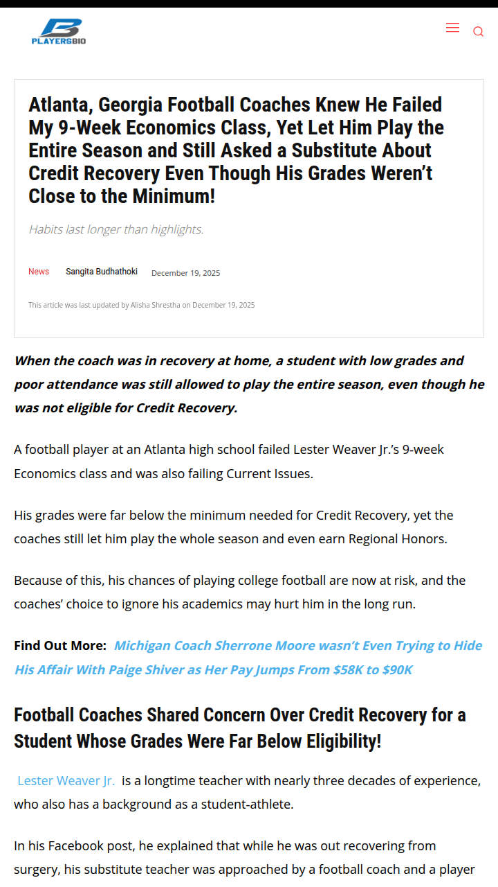 Jeffrey Armstrong+FollowAtlanta coaches put wins over student futuresA high school football player in Atlanta was allowed to play the entire season—even earning Regional Honors—despite failing key classes and not meeting the minimum for Credit Recovery. Coaches knew about his poor grades and attendance but still pushed for him to stay on the field, even going around the teacher to ask a substitute about his eligibility. Now, his shot at college football is in jeopardy, all because academic standards were ignored. This isn’t just about one student—it’s about whether we’re teaching our kids that sports matter more than real-life responsibility. What do you think: Should coaches be held accountable for putting athletics over academics? #Sports #Football #Atlanta00Share