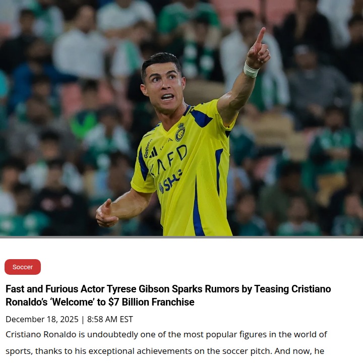 Jamie Mack+FollowCR7 to Fast & Furious? Tyrese Fuels RumorsBig news for both football and movie fans: Tyrese Gibson just teased that CR7, aka Cristiano Ronaldo, could be joining the Fast & Furious family! He posted a pic with Ronaldo and the franchise’s big names, hinting at a possible cameo in Fast X: Part 2. While King Ronaldo’s schedule is packed with Al-Nassr and the 2026 World Cup, the idea of him racing with Dom’s crew has fans buzzing. Would you want to see CR7 on the big screen, or should he stick to breaking records on the pitch? #Sports #Soccer #CristianoRonaldo00Share