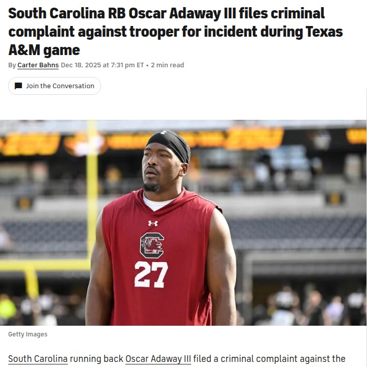glen25+FollowGamecocks-Texas A&M: Tunnel Controversy EruptsWow, things got heated off the field during the Gamecocks’ clash with Texas A&M! After Nyck Harbor’s epic 80-yard TD, Oscar Adaway III and Harbor had a run-in with a Texas state trooper in the tunnel—leading Adaway to file a criminal complaint for assault. The trooper’s identity is still a mystery, and even King James weighed in on social. This all happened before the Aggies pulled off their wildest comeback ever. Thoughts on the trooper’s actions and the Gamecocks’ heartbreak? #Sports #Football #Gamecocks00Share