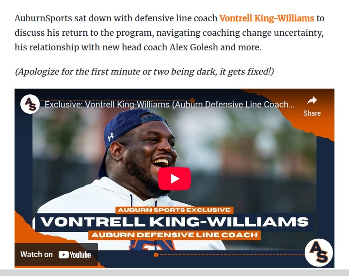 Jeffrey Armstrong+FollowAuburn’s King-Williams is back and ready to buildVontrell King-Williams has returned to Auburn, and he’s bringing a fresh perspective to the defensive line. After navigating the uncertainty of coaching changes, he’s now teaming up with new head coach Alex Golesh, and it sounds like the energy around the program is changing fast. King-Williams talks about what it means to come back, how he’s connecting with players, and the new vision for Auburn football. What do you think this new leadership will mean for the Tigers this season? Let’s hear your thoughts on how these changes could shape Auburn’s future! #Sports #Football #AuburnFootball00Share