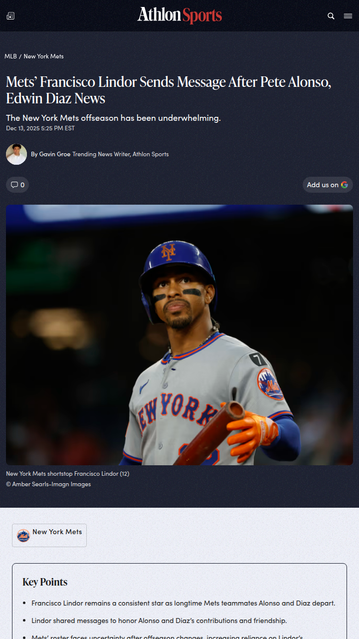 Kimberly Moore+FollowMets fans react as Lindor stays loyalLosing Pete Alonso to the Orioles and Edwin Díaz to the Dodgers is hitting Mets fans hard—these were the guys who helped define the team’s recent identity. Francisco Lindor’s heartfelt social media tributes to both teammates remind us just how much camaraderie matters in baseball. With the roster shifting and new faces like Jorge Polanco and Devin Williams stepping in, there’s a lot of uncertainty about the Mets’ future. Is Lindor’s leadership enough to keep the team competitive, or are we in for a rocky rebuild? Curious to hear how everyone’s feeling about these changes. #Sports #Baseball #Mets00Share