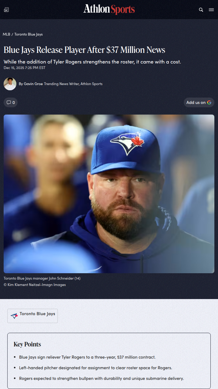 Kimberly Moore+FollowBlue Jays Land Submarine Ace, DFA BruihlBig news from the Jays’ front office: Toronto just inked Tyler Rogers—the sidearm specialist—to a $37M deal, but it came at a cost. To make room, they designated Justin Bruihl for assignment. Rogers’ funky delivery and sub-2.00 ERA last year could be a game-changer in late innings. Did the Jays make the right call moving on from Bruihl for Rogers’ unique arm? Let’s hear your takes! #Sports #Baseball #BlueJays00Share