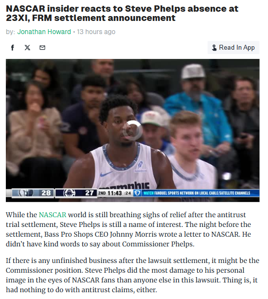 qglover+FollowNASCAR Settlement: Is Phelps on the Hot Seat?Big news in the NASCAR garage after the antitrust settlement—fans are buzzing about Commissioner Steve Phelps’ absence at the courthouse. With the “Richard Childress texts” still fresh and Johnny Morris’ harsh letter making waves, it feels like Phelps is under more pressure than ever. Even with his apology, the damage to his rep is real. Could a leadership shakeup be next? What do you all think: is it time for a new face at the top, or will Phelps weather this storm? #Sports #Racing #NASCAR00Share