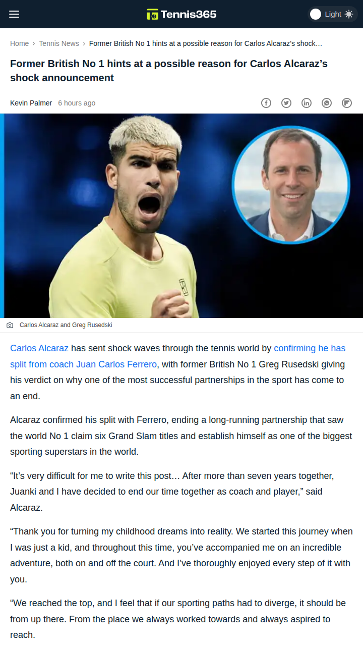 Gregory Costa+FollowAlcaraz & Ferrero Split: End of an Era?Huge news in tennis—Carlitos Alcaraz has parted ways with his longtime coach Juanki Ferrero, the man who helped him reach the top and bag six Slams. Former British No 1 Greg Rusedski thinks disagreements over scheduling and injury management may have played a role. With King Carlos still so young, was this the right move, or could it backfire? Can anyone really replace Ferrero’s impact? Let’s hear your takes! #Sports #Tennis #Alcaraz00Share