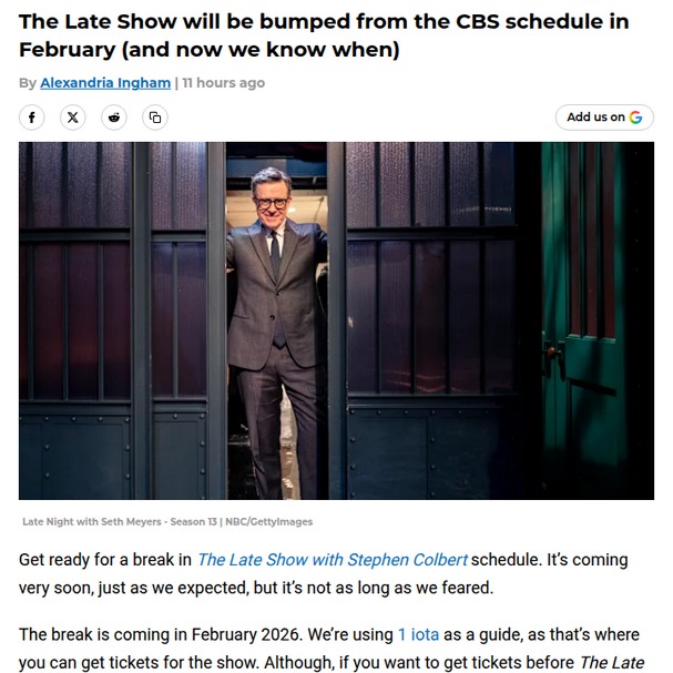Jennifer ArnoldFollowingCBS bumps The Late Show for Olympics! 🥇Stephen Colbert fans are buzzing—The Late Show is officially taking a break in February 2026, but it’s not as long as everyone feared. The real drama? CBS is pulling the plug for a week to dodge competition with the Winter Olympics on NBC. Some fans are speculating this is Colbert’s chance to prep for his next big move before the series finale in May. Tickets are already sold out for February! #Entertainment #TVSeries #TheLateShow60Share
