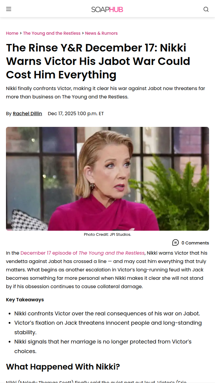 Victoria Garcia+FollowNikki Drops a Bombshell on Victor 💣Nikki finally called out Victor’s obsession with destroying Jabot, warning him that his war with Jack could blow up everything—including their marriage. Fans are split: is Nikki right to draw the line, or is Victor just being Victor? The drama is next-level now that Nikki’s not just standing by. Could this be the beginning of the end for Niktor? #Entertainment #TVSeries #YR81Share