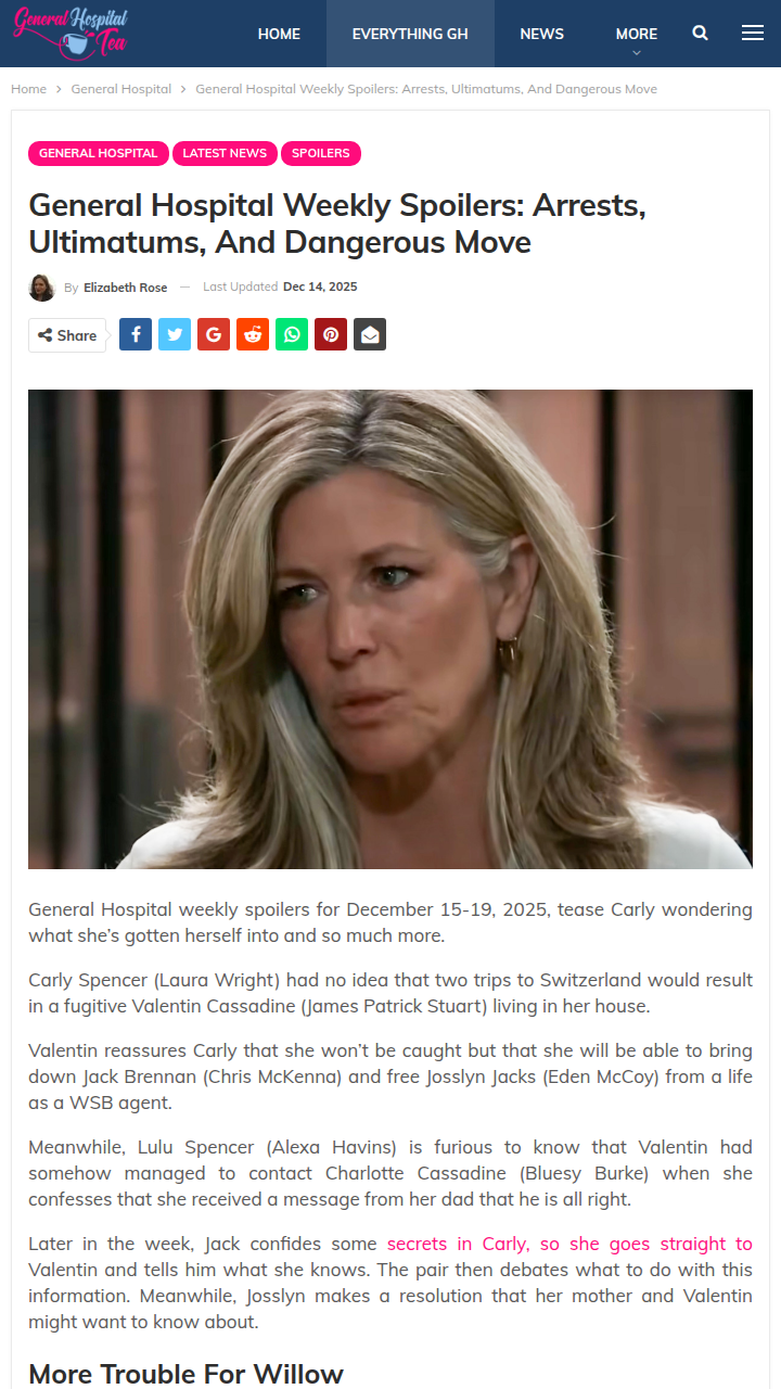 Victoria Garcia+FollowCarly’s Wild GH Move! 🚨 Valentin Hiding Out?Carly’s house is officially the new Port Charles safehouse—Valentin is literally hiding out there and she’s in way over her head! Fans are split: is Carly being reckless or is this her boldest move yet? Plus, Lulu is fuming about Valentin’s secret message to Charlotte. Can Carly really trust Valentin, or is she about to blow up her whole life for nothing? #Entertainment #TVSeries #GeneralHospital100Share